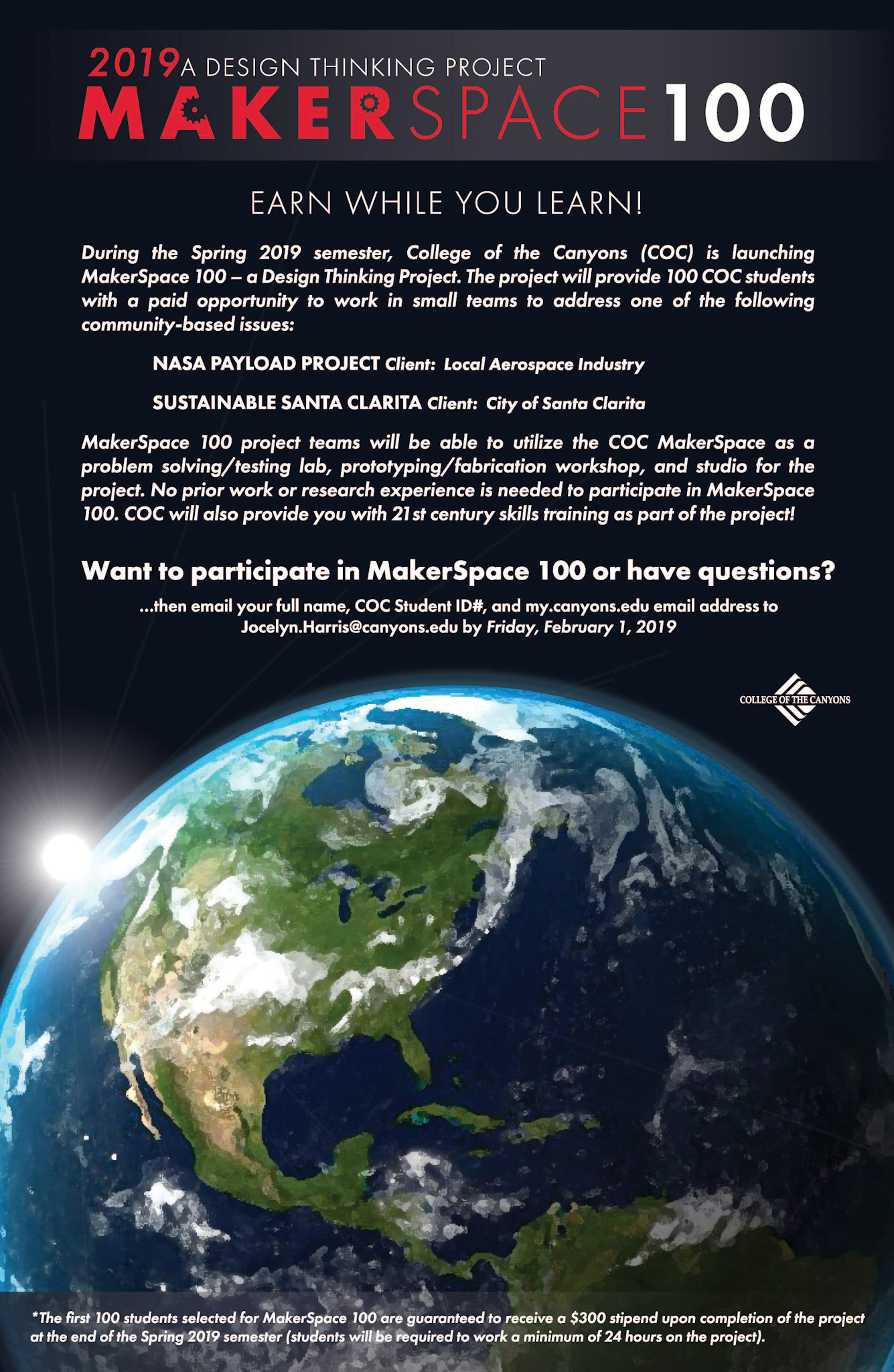 Created the poster, email flyer and instagram post for the MakerSpace 100 project.
